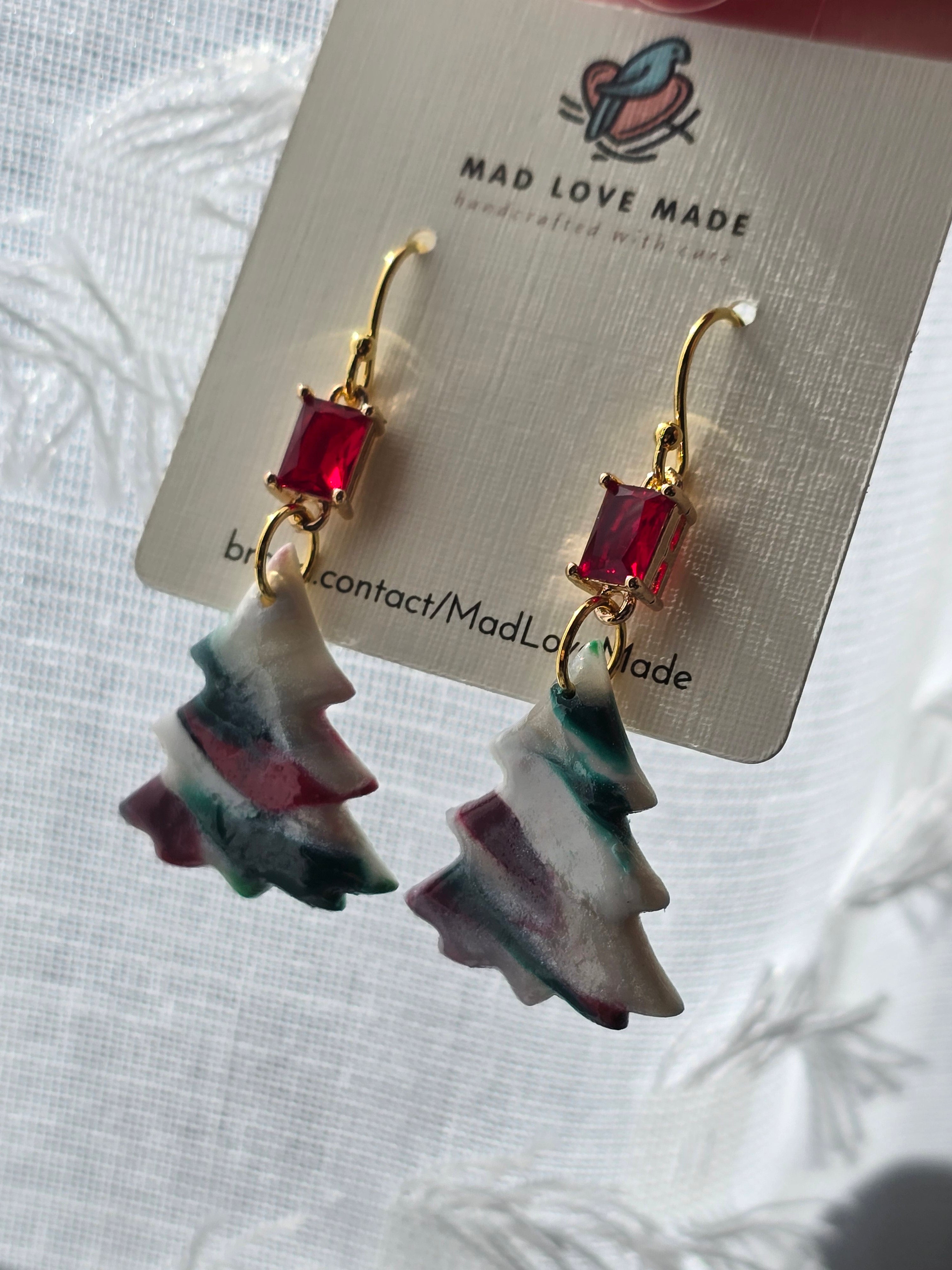 White Christmas: Tree with Gemstone Accent - Polymer Clay Dangle Earrings